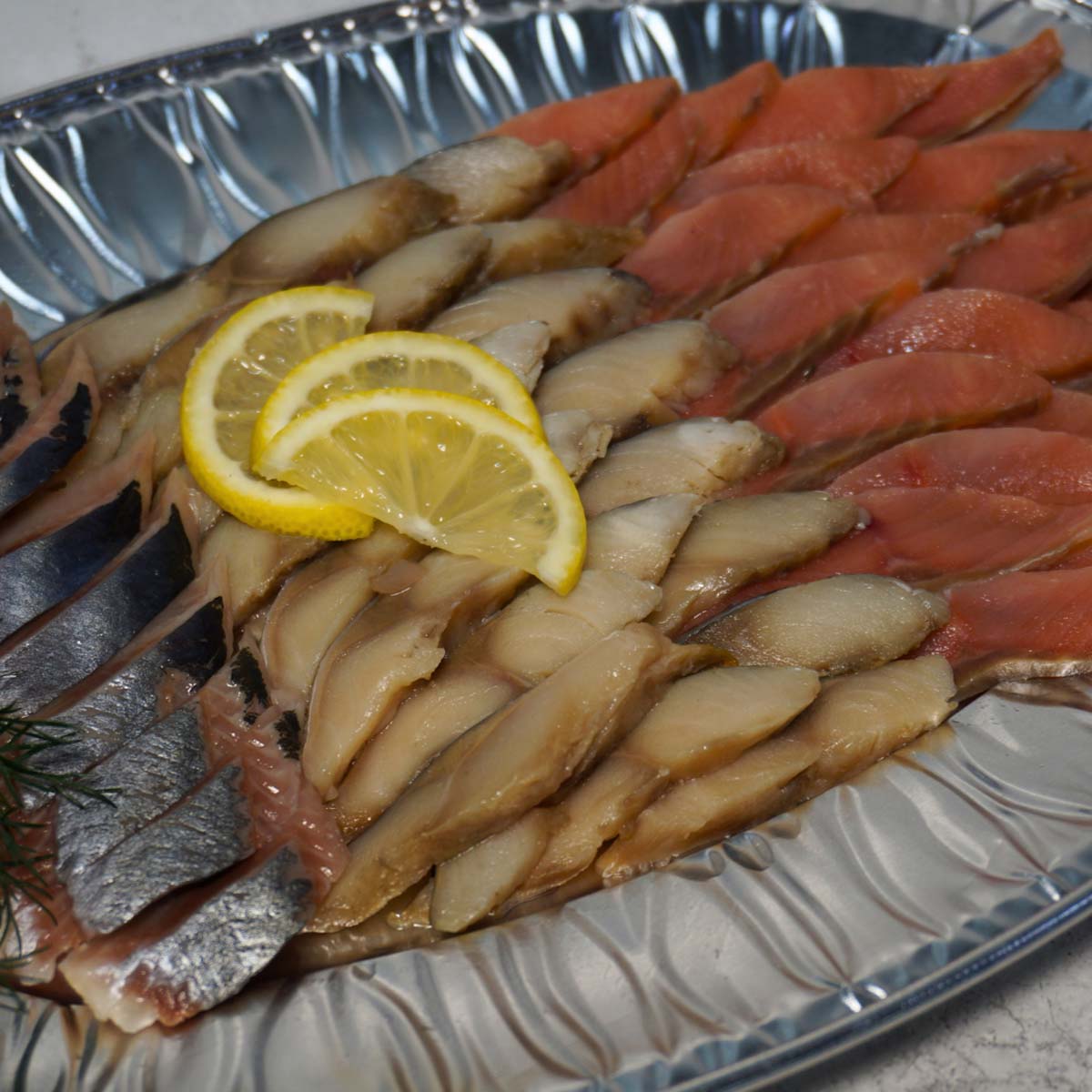 Состав: красная рыба с/с, масляная х/к, скумбрия х/к, лимон, зелень, оливки, зелень