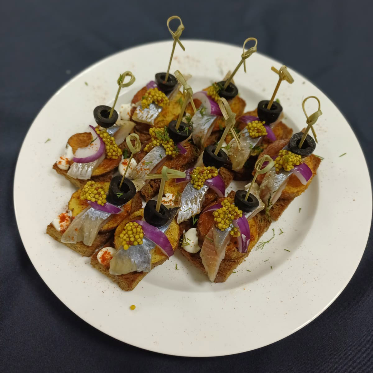 Состав: Мини тосты из бородинского хлеба, филе сельди, картофель, красный лук, соленый огурец, чесночное масло
