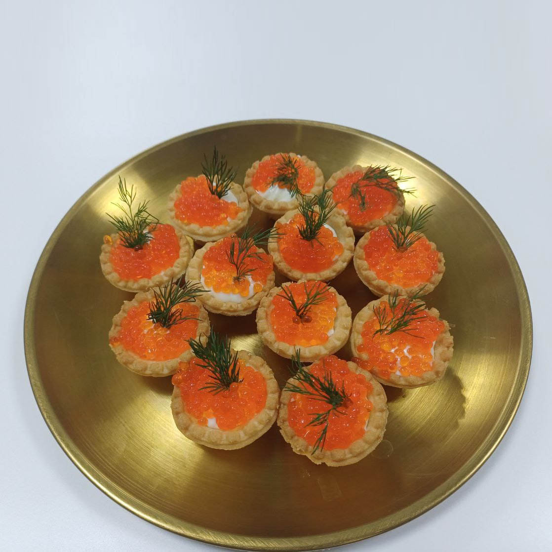 Состав: тарталетка (Мука пшеничная высшего сорта, маргарин, яйцо куриное, сода пищевая, соль), икра красная имитированная, сыр сливочный