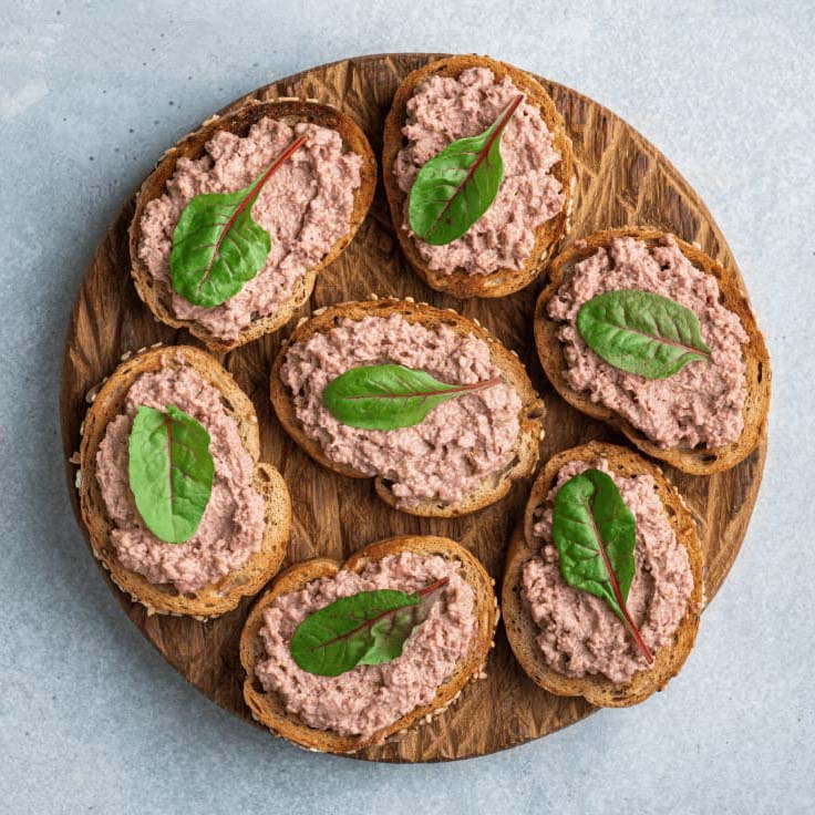 Состав: Багет (мука пшеничная в.с., вода, соль, высушенная пшеничная закваска, солод ржаной неферментированный, дрожжи хлебопекарные), лук репчатый, морковь, куриная печень, сливки, специи