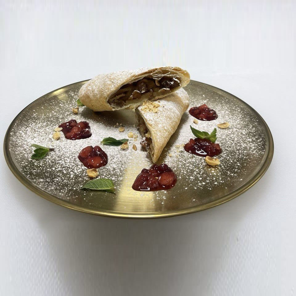 Состав: тесто слоёное (мука, масло сливочное, вода, сахар) яблоки, изюм, фундук, масло сливочное, корица, сахар