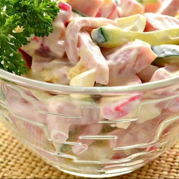 Состав: Ветчина из индейки, майонез, огурцы маринованные, шампиньоны жареные, сырный продукт, перец болгарский свежий, яйцо куриное, зелень