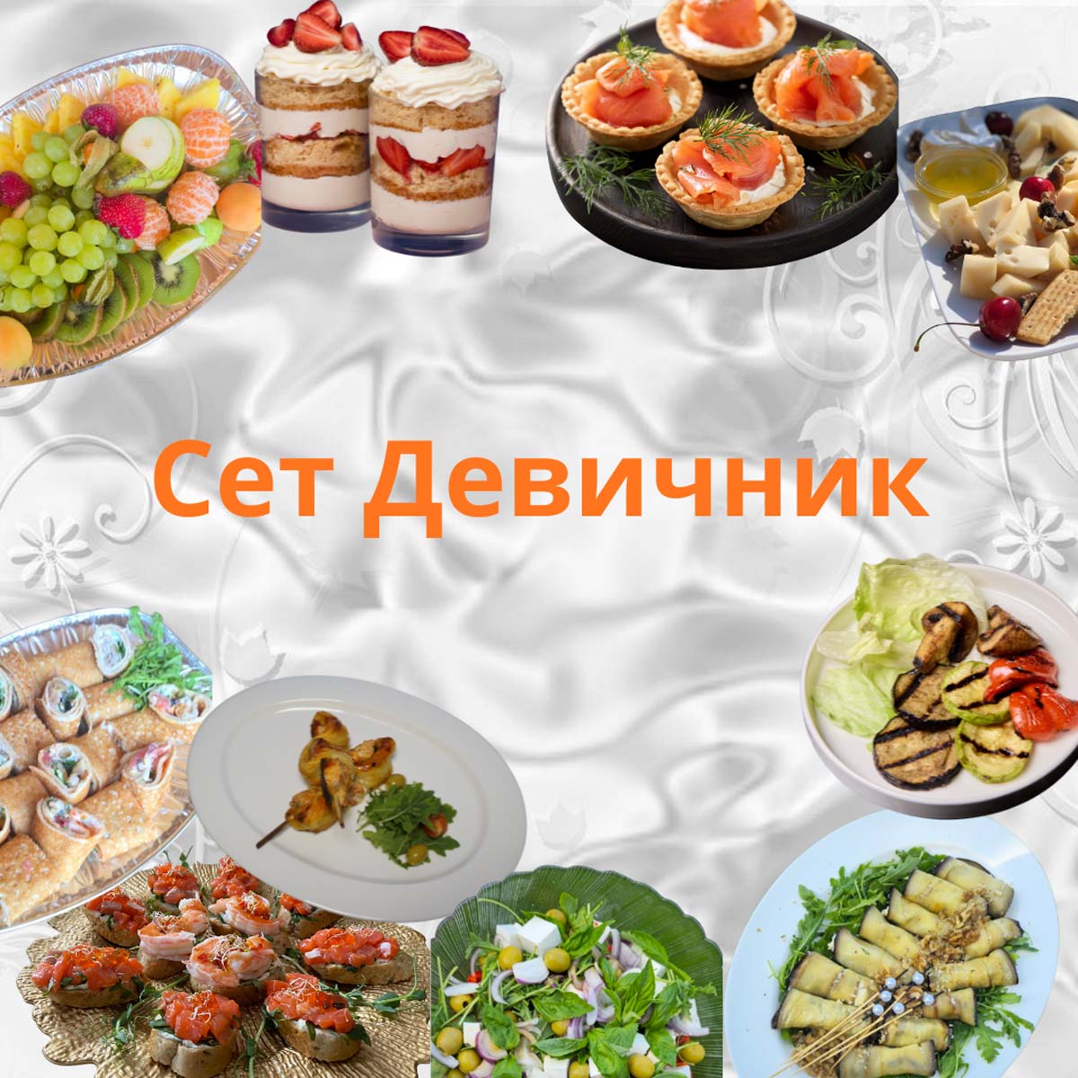 Состав: фруктовая тарелка, сырная, тарталетки с икрой, брускетты с горбушей, рулетики из баклажанов, роллы из блинчиков с грибами, шашлык из красной рыбы, салат греческий,овощи гриль, трайфл клубничный