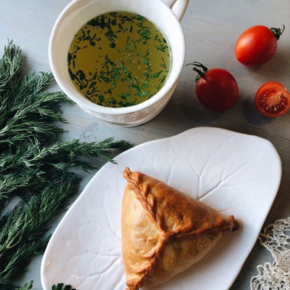 Состав: бульон - вода, суповой набор куриный, морковь, лук, петрушка, соль. Треугольник с мясом - тесто дрожжевое (мука, вода, масло подсолнечное первого холодного отжима, сахар, дрожжи, соль), мясо птицы, картофель, лук репчатый, масло сливочное, масло подсолнечное, мука, соль, перец черный молотый. 10 порций (вес бульона 250 г/порция, вес треугольника 100 г/шт)